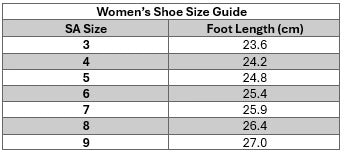 If you wear a half size, have a higher-than-normal bridge, or flat feet, please contact us at sales@vvdl.co.za or 061 512 3668 so we can confirm your measurements with your order.